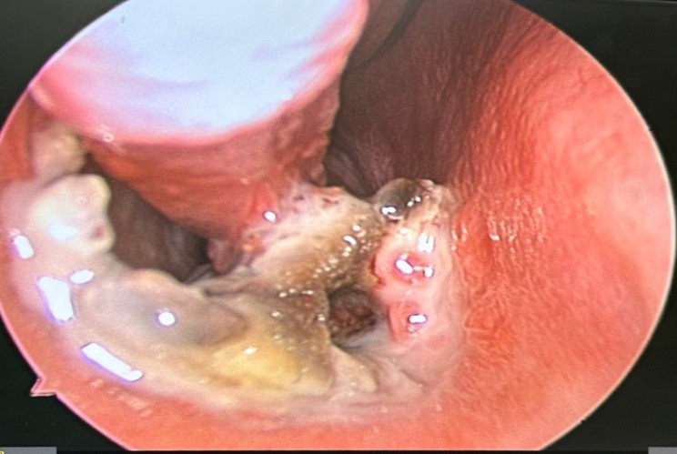 Sau khi được thăm khám và nội soi mũi xoang kiểm tra, chúng tôi phát hiện có một khối sùi màu đen, xuất huyết quanh khối sùi, tăng sinh nhiều mô hạt, đọng nhiều dịch nhầy trong hốc mũi bên phải