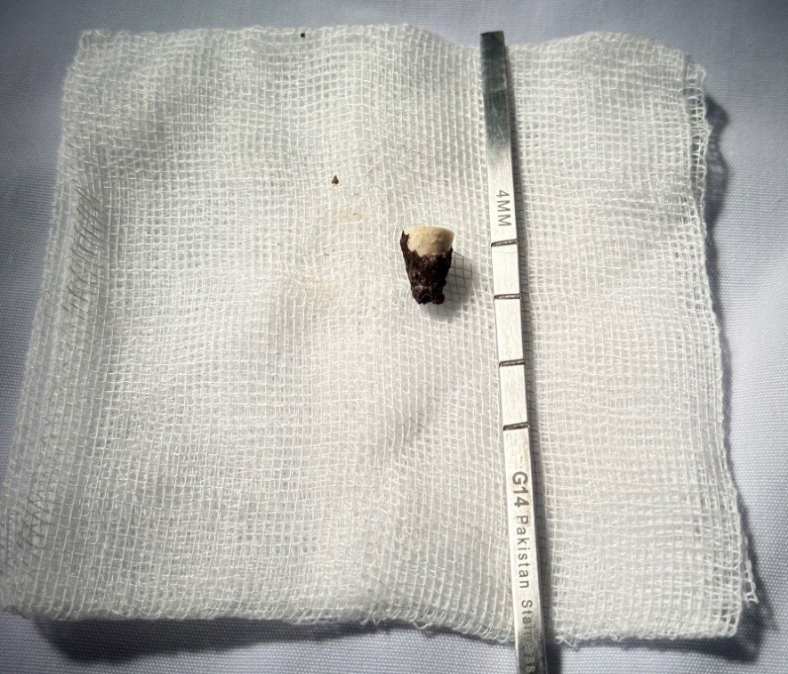Dị vật được lấy ra dài khoảng 1 cm , hình nón cụt, có lõi rỗng ở giữa và bị bao bọc bởi mô hạt trong hốc mũi